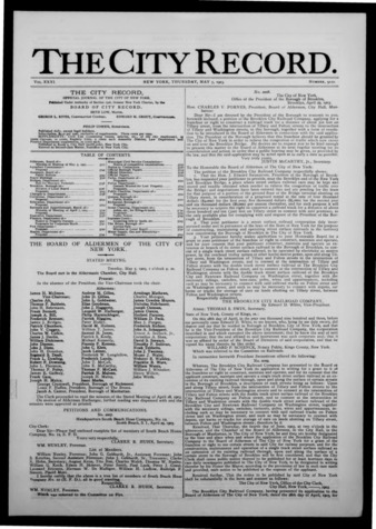 The City Record newspaper publishes notices which includes but is not limited to: public hearings and meetings, public auctions and sales, solicitations and awards and official rules proposed and adopted by city agencies. This is the City Record Newspaper for May 07, 1903.