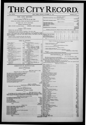 The City Record newspaper publishes notices which includes but is not limited to: public hearings and meetings, public auctions and sales, solicitations and awards and official rules proposed and adopted by city agencies. This is the City Record Newspaper for October 28, 1904.