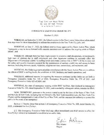Emergency Executive Order No. 871 is being submitted to extend Emergency Executive Order No. 869, dated October 10, 2025; for five (5) days as it relates to Rikers.