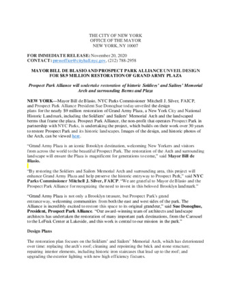 Mayor's Press Release: MAYOR BILL DE BLASIO AND PROSPECT PARK ALLIANCE UNVEIL DESIGN FOR $8.9 MILLION RESTORATION OF GRAND ARMY PLAZA