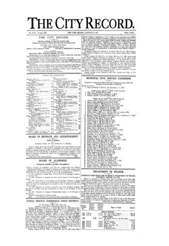 The City Record newspaper publishes notices which includes but is not limited to: public hearings and meetings, public auctions and sales, solicitations and awards and official rules proposed and adopted by city agencies. This is the City Record Newspaper for January 25, 1915.