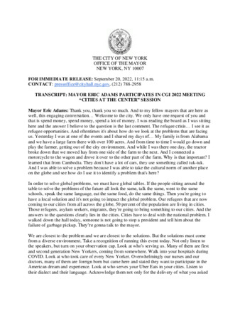 A transcript about New York City Mayor Eric Adams participates in CGI 2022 Meeting "Cities at the Center" Session.