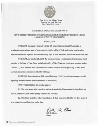 The Mayor of New York City makes an extension of Emergency Order regarding waiver of certain Local Laws related to demolition.