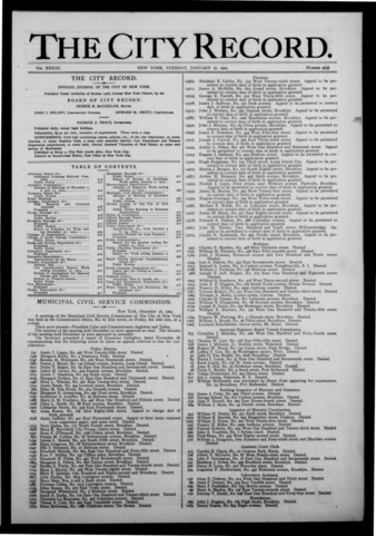 The City Record newspaper publishes notices which includes but is not limited to: public hearings and meetings, public auctions and sales, solicitations and awards and official rules proposed and adopted by city agencies. This is the City Record Newspaper for January 17, 1905.