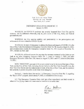 Emergency Executive Order No. 13 extends Emergency Executive Order No. 9, dated January 9, 2022, for 5 days. It relates to the City's Key to NYC program and the COVID-19 pandemic.