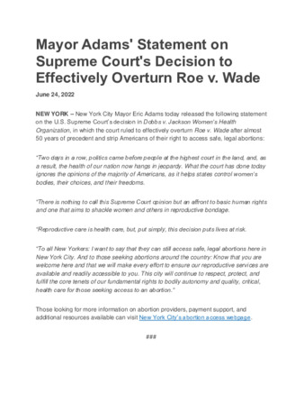 New York City Mayor Eric Adams' statement on Supreme Court's decision on Dobbs v. Jackson Women's Health Organization, overturning Roe V. Wade.