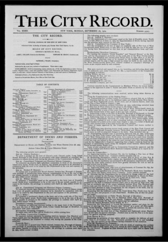 The City Record newspaper publishes notices which includes but is not limited to: public hearings and meetings, public auctions and sales, solicitations and awards and official rules proposed and adopted by city agencies. This is the City Record Newspaper for September 26, 1904.