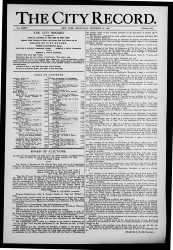 The City Record newspaper publishes notices which includes but is not limited to: public hearings and meetings, public auctions and sales, solicitations and awards and official rules proposed and adopted by city agencies. This is the City Record Newspaper for December 19, 1906.