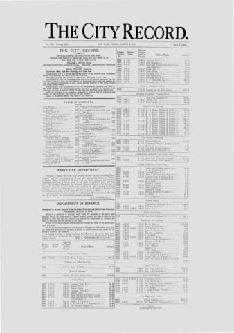 The City Record newspaper publishes notices which includes but is not limited to: public hearings and meetings, public auctions and sales, solicitations and awards and official rules proposed and adopted by city agencies. This is the City Record Newspaper for August 08, 1913.