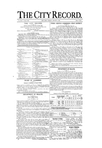 The City Record newspaper publishes notices which includes but is not limited to: public hearings and meetings, public auctions and sales, solicitations and awards and official rules proposed and adopted by city agencies. This is the City Record Newspaper for January 05, 1915.
