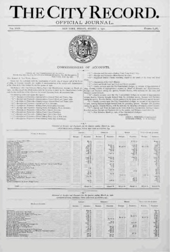 The City Record newspaper publishes notices which includes but is not limited to: public hearings and meetings, public auctions and sales, solicitations and awards and official rules proposed and adopted by city agencies. This is the City Record Newspaper for August 02, 1901.
