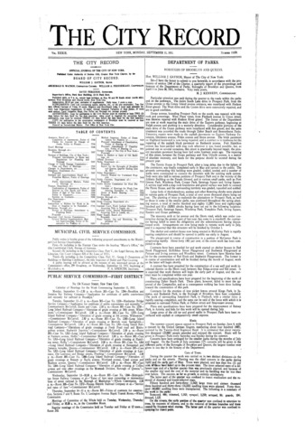 The City Record newspaper publishes notices which includes but is not limited to: public hearings and meetings, public auctions and sales, solicitations and awards and official rules proposed and adopted by city agencies. This is the City Record Newspaper for September 11, 1911.