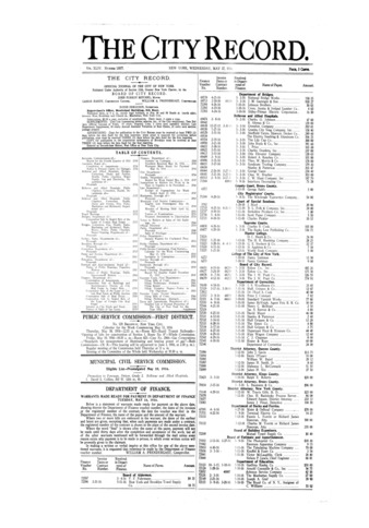The City Record newspaper publishes notices which includes but is not limited to: public hearings and meetings, public auctions and sales, solicitations and awards and official rules proposed and adopted by city agencies. This is the City Record Newspaper for May 17, 1916 with supplement.