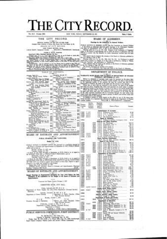 The City Record newspaper publishes notices which includes but is not limited to: public hearings and meetings, public auctions and sales, solicitations and awards and official rules proposed and adopted by city agencies. This is the City Record Newspaper for September 28, 1917.
