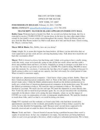 Mayor's Press Release: MAYOR DE BLASIO APPEARS ON INSIDE CITY HALL