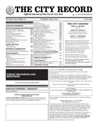 The City Record newspaper publishes notices which includes but is not limited to public hearings and meetings, public auctions and sales, solicitations and awards and official rules proposed and adopted by city agencies.