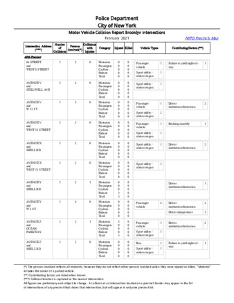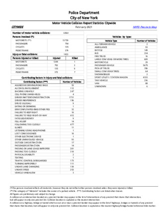 Pursuant to Admin Code Sect. 14-153(a), this monthly report contains 1) the number of moving violation summonses issued; 2) the number of traffic crashes; and 3) the number of traffic-related fatalities and injuries