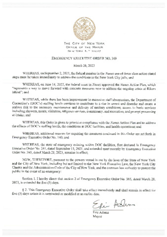 Emergency Executive Order No. 369, is being submitted to extend Emergency Executive Order No. 365, dated March 21, 2023, for five (5) days, if this relates to Rikers.