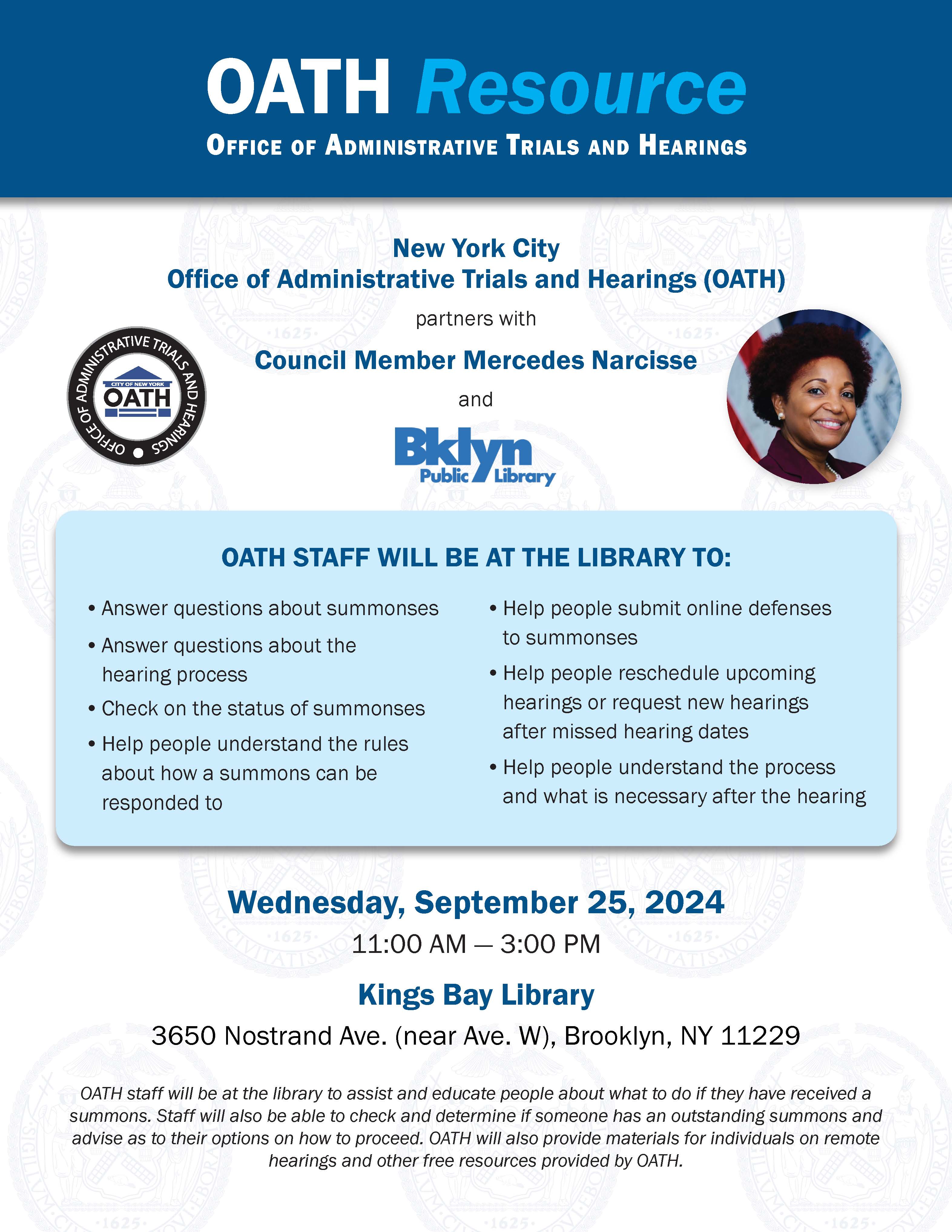 OATH staff were at the library to assist and educate people about what to do should they have received a summons and to check to determine if someone has an outstanding summons. Materials about remote hearings and other free resources were provided to the public as well.