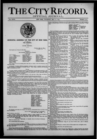 The City Record newspaper publishes notices which includes but is not limited to: public hearings and meetings, public auctions and sales, solicitations and awards and official rules proposed and adopted by city agencies. This is the City Record Newspaper for May 18, 1899.