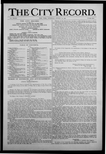 The City Record newspaper publishes notices which includes but is not limited to: public hearings and meetings, public auctions and sales, solicitations and awards and official rules proposed and adopted by city agencies. This is the City Record Newspaper for August 10, 1905.