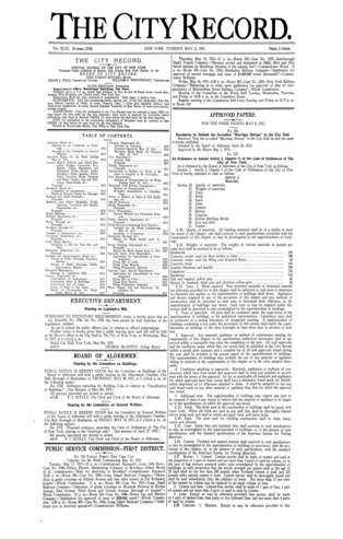 The City Record newspaper publishes notices which includes but is not limited to: public hearings and meetings, public auctions and sales, solicitations and awards and official rules proposed and adopted by city agencies. This is the City Record Newspaper for May 11, 1915.