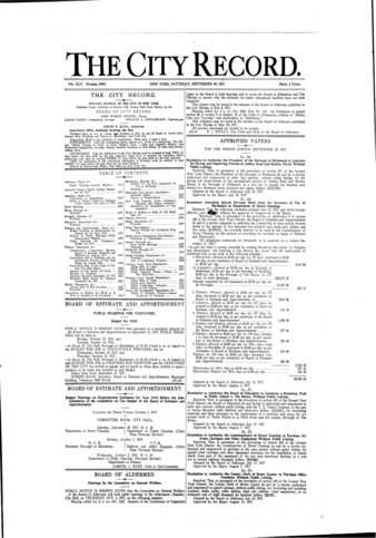 The City Record newspaper publishes notices which includes but is not limited to: public hearings and meetings, public auctions and sales, solicitations and awards and official rules proposed and adopted by city agencies. This is the City Record Newspaper for September 29, 1917.