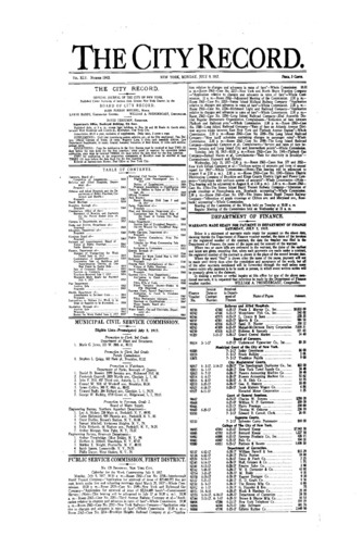 The City Record newspaper publishes notices which includes but is not limited to: public hearings and meetings, public auctions and sales, solicitations and awards and official rules proposed and adopted by city agencies. This is the City Record Newspaper for July 09, 1917.