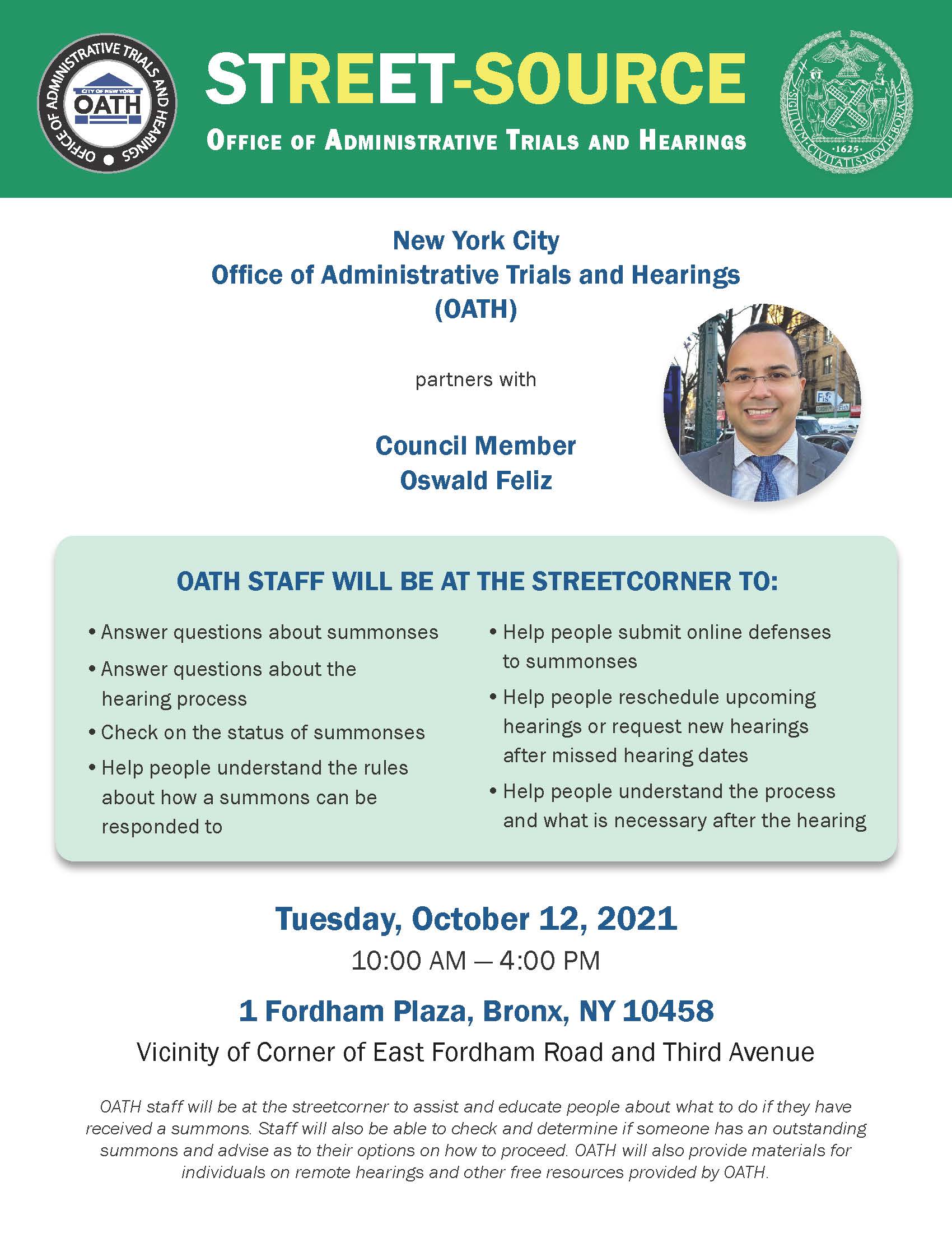 OATH staff were at the streetcorner to assist and educate people about what to do should they have received a summons and to check to determine if someone has an outstanding summons. Materials about remote hearings and other free resources were provided to the public as well.