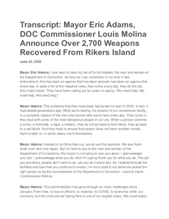 Transcript: Mayor Eric Adams, DOC Commissioner Louis Molina Announce Over 2,700 Weapons Recovered From Rikers Island