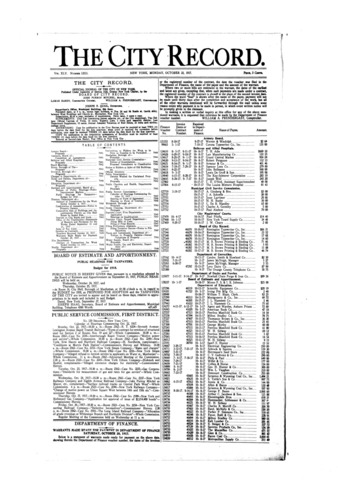 The City Record newspaper publishes notices which includes but is not limited to: public hearings and meetings, public auctions and sales, solicitations and awards and official rules proposed and adopted by city agencies. This is the City Record Newspaper for October 22, 1917.