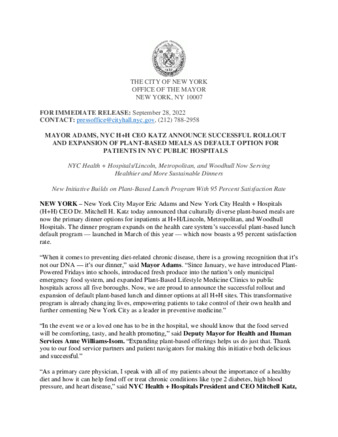 MAYOR ADAMS, NYC H+H CEO KATZ ANNOUNCE SUCCESSFUL ROLLOUT AND EXPANSION OF PLANT-BASED MEALS AS DEFAULT OPTION FOR PATIENTS IN NYC PUBLIC HOSPITALS