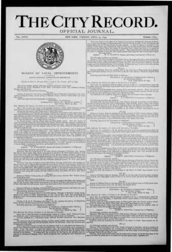 The City Record newspaper publishes notices which includes but is not limited to: public hearings and meetings, public auctions and sales, solicitations and awards and official rules proposed and adopted by city agencies. This is the City Record Newspaper for April 25, 1899.