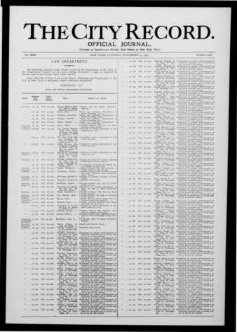The City Record newspaper publishes notices which includes but is not limited to: public hearings and meetings, public auctions and sales, solicitations and awards and official rules proposed and adopted by city agencies. This is the City Record Newspaper for November 25, 1902.