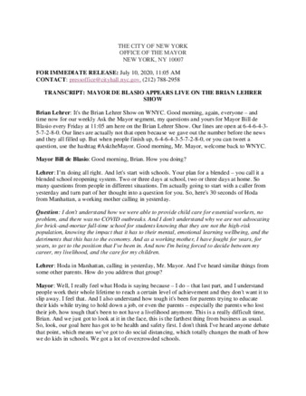 Mayor's Press Release: MAYOR DE BLASIO APPEARS LIVE ON THE BRIAN LEHRER SHOW