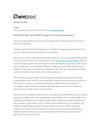 Mayor's Press Release: NYCEDC and CUNY Launch IN2NYC Program for International Entrepreneurs