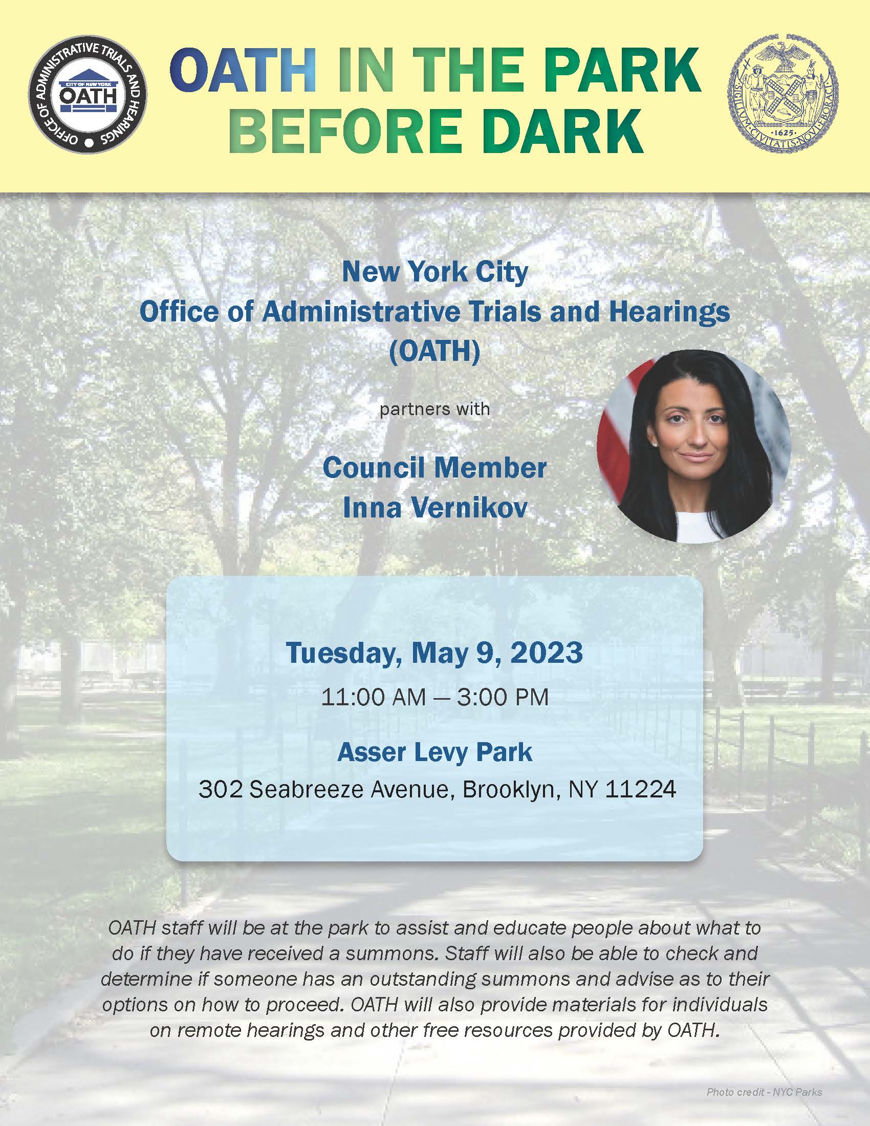 OATH staff were at the park to assist and educate individuals about what to do should they have received a summons and to check to determine if someone has an outstanding summons. Materials about remote hearings and other free resources were provided to the public as well.