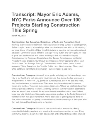 Transcript: Mayor Eric Adams, NYC Parks Announce Over 100 Projects Starting Construction This Spring