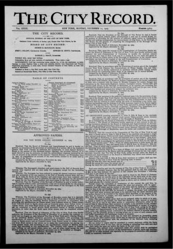 The City Record newspaper publishes notices which includes but is not limited to: public hearings and meetings, public auctions and sales, solicitations and awards and official rules proposed and adopted by city agencies. This is the City Record Newspaper for December 12, 1904.