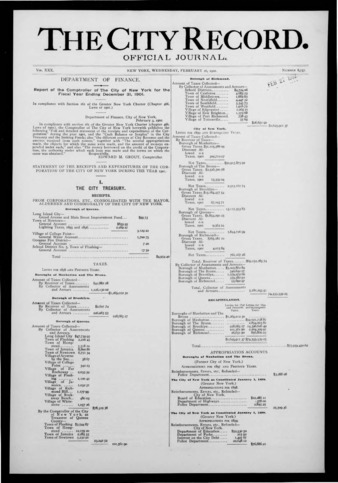 The City Record newspaper publishes notices which includes but is not limited to: public hearings and meetings, public auctions and sales, solicitations and awards and official rules proposed and adopted by city agencies. This is the City Record Newspaper for February 26, 1902.