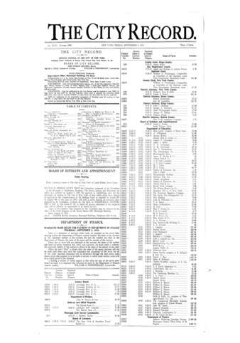 The City Record newspaper publishes notices which includes but is not limited to: public hearings and meetings, public auctions and sales, solicitations and awards and official rules proposed and adopted by city agencies. This is the City Record Newspaper for September 03, 1915.