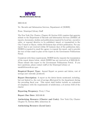A report on the duties herein mentioned, including, but not limited to, the cost of savings effectuated by the department during the preceding fiscal year. This report shall further include an evaluation of compliance with the requirements of subdivision a of section 1133 of the charter