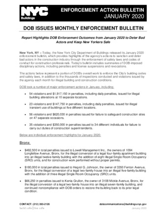 DOB releases Enforcement Bulletins each month that highlight the Agency's actions to sanction and deter bad actors in the construction industry through the enforcement of safety laws and codes of conduct for construction professionals.