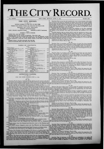 The City Record newspaper publishes notices which includes but is not limited to: public hearings and meetings, public auctions and sales, solicitations and awards and official rules proposed and adopted by city agencies. This is the City Record Newspaper for June 12, 1905.