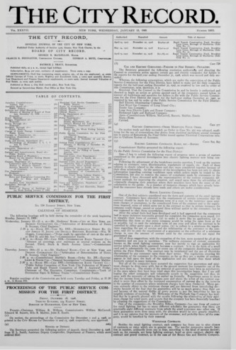 The City Record newspaper publishes notices which includes but is not limited to: public hearings and meetings, public auctions and sales, solicitations and awards and official rules proposed and adopted by city agencies. This is the City Record Newspaper for January 13, 1909.