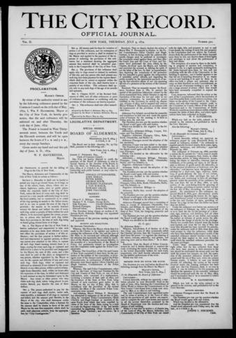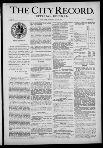 The City Record Newspapers publishes notices which include but is not limited to: public hearings and meetings, public auctions and sales, solicitations and awards and official rules proposed and adopted by city agencies. This is the City Record Newspaperss for July 1874.