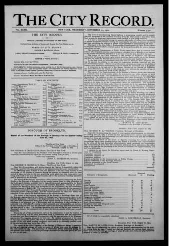 The City Record newspaper publishes notices which includes but is not limited to: public hearings and meetings, public auctions and sales, solicitations and awards and official rules proposed and adopted by city agencies. This is the City Record Newspaper for September 21, 1904.