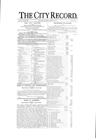 The City Record newspaper publishes notices which includes but is not limited to: public hearings and meetings, public auctions and sales, solicitations and awards and official rules proposed and adopted by city agencies. This is the City Record Newspaper for February 27, 1915 with supplement.