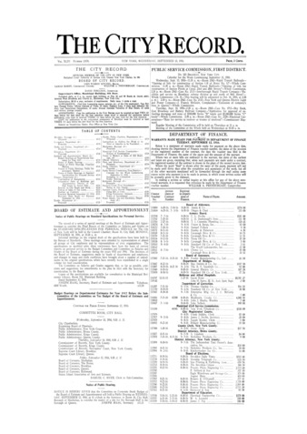 The City Record newspaper publishes notices which includes but is not limited to: public hearings and meetings, public auctions and sales, solicitations and awards and official rules proposed and adopted by city agencies. This is the City Record Newspaper for September 13, 1916.