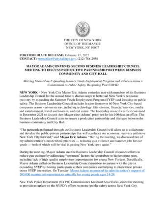 | User Ciara Collins has attached Mayor_s_Press_Office_Feb_17d_2022.pdf to MAYOR ADAMS CONVENES SECOND BUSINESS LEADERSHIP COUNCIL MEETING TO DISCUSS PRODUCTIVE PARTNERSHIP BETWEEN BUSINESS COMMUNITY AND CITY HALL |